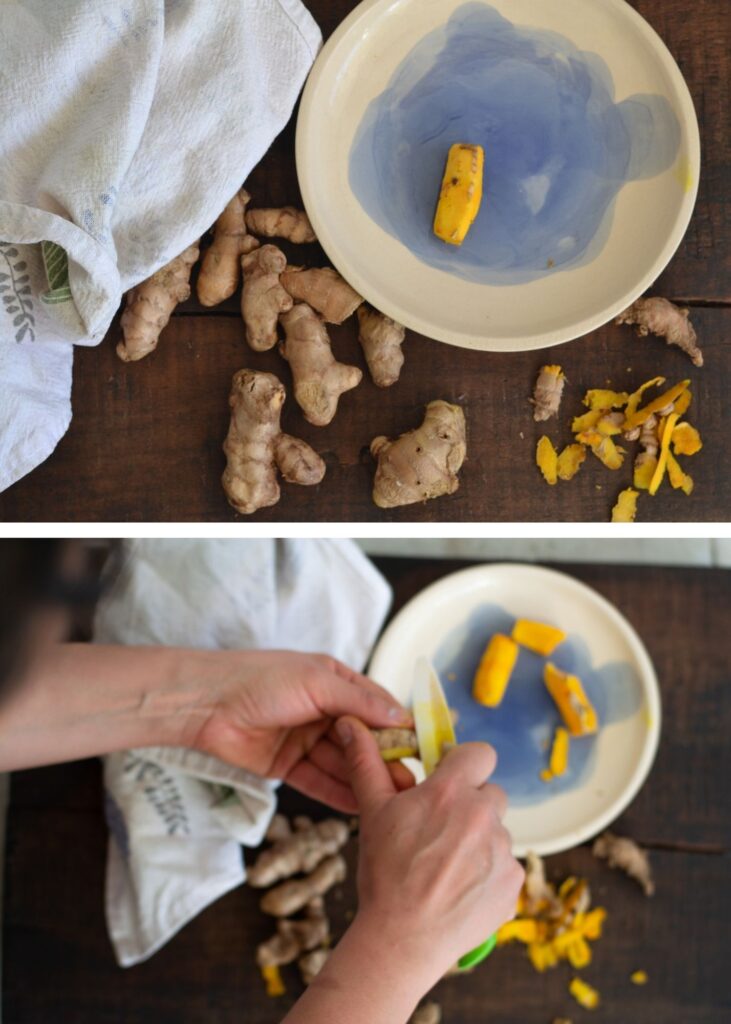 Lo primero que vas a hacer cuando tengas los rizomas es ponerlos en remojo con agua, yo los deje toda la noche porque me olvide. Pero con un remojo de 2 horas creo que va a estar bien o limpiándolos bien debajo del chorro de agua. Lo segundo es pelarlos con un cuchillito con sumo cuidado de no sacarles mas de la cuenta. Yo uso de cerámica porque conservan las propiedades de los alimentos.